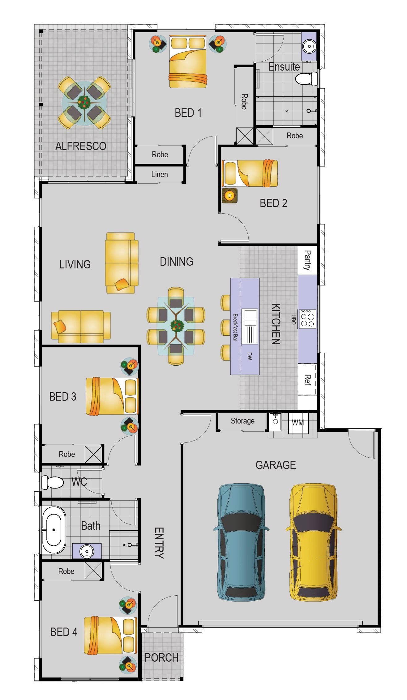 This contemporary four-bedroom design is crafted for modern Australian living, centering around a bright, open-plan heart where the kitchen, dining, and family areas merge seamlessly. The transition to the outdoors is just as fluid, with the main living zone opening onto a generous alfresco terrace perfect for year-round entertaining.